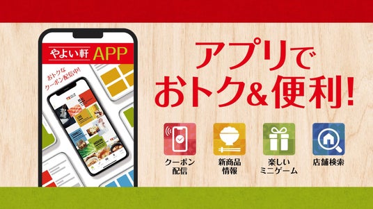 「やよい軒」公式アプリでは、新商品・キャンペーン情報・メニューの閲覧や店舗検索がご利用いただけます。また、定食やサイドメニューがお得になるQRクーポンを配信しております。
