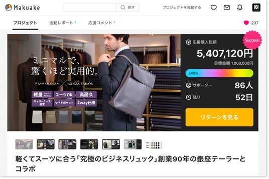 銀座テーラーとコラボした進化版、クラファン開始8分で目標金額100万円達成