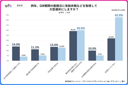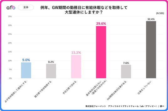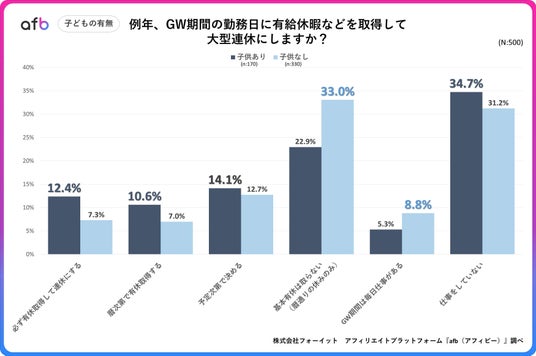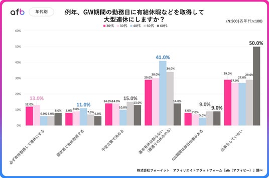アフィリエイトプラットフォーム「afb(アフィビー)」< https://www.afi-b.com/ >の開発運用をおこなう株式会社フォーイットは、全国の20代~60代までの男女500人を対象にゴールデンウィークに関するアンケートを実施し、年代別等の特徴についてまとめました。