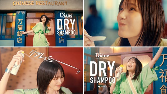中華料理屋「万福飯店」の前で無邪気な様子で振り返り、なにやら自信ありげな表情を見せる本田さん。空腹をさらに刺激するような美味しい香りで充満された店内へ、いざ。周りのお客さんが注文した料理を見ながら、自分は何を食べようかとワクワクしながら進んでいきます。そんな本田さんの前に運ばれてきたのは、真っ赤で熱々な麻婆豆腐。やっとありついた料理を前に笑みがこぼれ、思い切り食べ進めます。辛さと暑さでうちわのように手をパタパタさせながらも食べる手を止めません。汗がにじんできた本田さんの視線の先には、持っていたダイアンのドライシャンプー。ロボットアームを使ったユニークなカメラアングルで噴射されるドライシャンプーで、本田さんは瞬時*3にリフレッシュ。冒頭に本田さんが見せた自信の理由は、ドライシャンプーをお守りとして持っていたからでした。美味しい麻婆豆腐を食べ、汗をかいてもすっきりリフレッシュした本田さんの幸せそうな笑顔で、こちらもつい微笑んでしまうCMに仕上がりました。