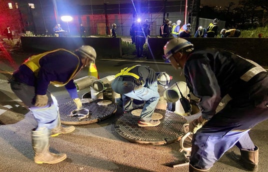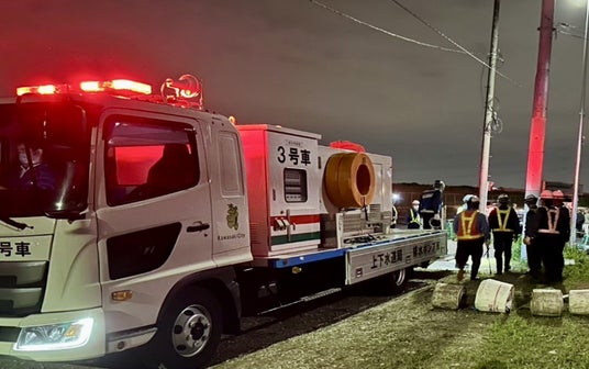 川崎市上下水道局では、令和元年東日本台風による浸水被害を踏まえ、多摩川の排水樋管(雨水などの内水を河川に排水する構造物)における対策として、樋管ゲートの電動化、排水ポンプ車の導入等の浸水対策を行い、これまで各排水樋管で排水訓練を実施してまいりました。