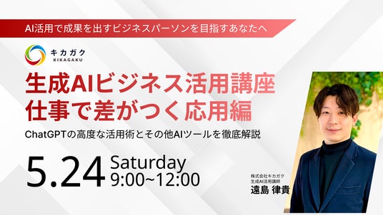 教育 × AI を軸に DX 人材育成を支援する株式会社キカガク (本社:東京都渋谷区, 代表取締役:大崎 将寛) は, 2025 年 5 月 24 日 (土) に, ウェビナー "生成AIビジネス活用講座~仕事で差がつく応用編~" を開催いたします。
