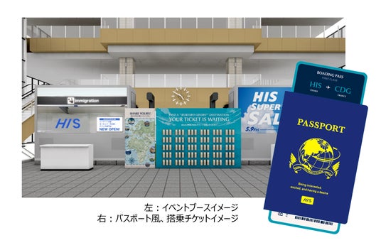 ご来場の方にパスポート風ノートをお渡しします。メインボードに貼られた各国ごとの「Travel Tips(旅行のヒントやアドバイス)」が書かれた搭乗チケットを選んでいただき、パスポート風ノートと一緒に疑似出発カウンターにご提出いただくと、出発スタンプ押印とノベルティをプレゼントいたします。さらに搭乗チケットに記載のアンケートに回答いただくと、抽選で2名様に5万円分のHIS旅行券が当たるイベントも実施します。
