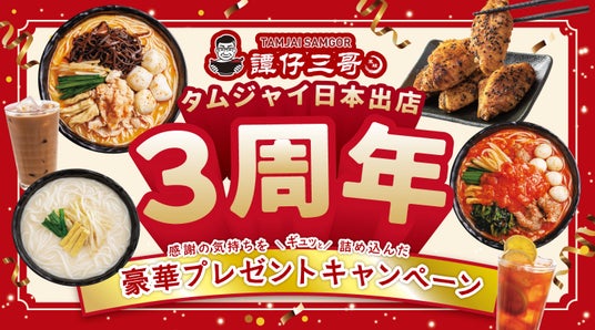株式会社譚仔三哥日本(本社:東京都渋谷区、代表取締役 劉達民)は、食の感動体験を追求し「一度食べたら忘れられないウマさ。」を提供する香港発のライスヌードル店「譚仔三哥(タムジャイサムゴー)」(以下、譚仔三哥)を展開しています。この度、譚仔三哥は2025年に日本上陸から3周年を迎えることを記念し、 2025年5月9日(金)より、公式インスタグラムおよび店頭にてお客さまへの感謝を込めた豪華プレゼントキャンペーンを実施いたします。