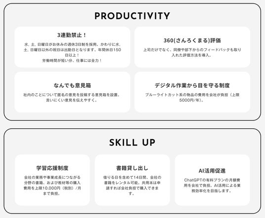 「&BOX」 では、すべての福利厚生制度を「生産性(Productivity)」、「スキルアップ(Skill Up)」、「コミュニケーション(Communication)」、「プライベート(Private)」、および「一般(General)」の5つのカテゴリーに分けています。今後はこれらの各カテゴリーをバランスよく強化し、全従業員が適切な休息を取り、リフレッシュされた状態で仕事をするための福利厚生のさらなる拡充に努めてまいります。
