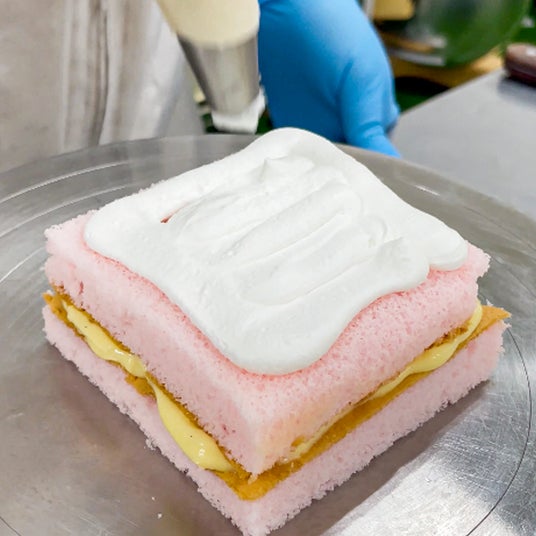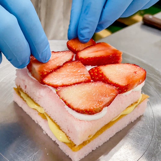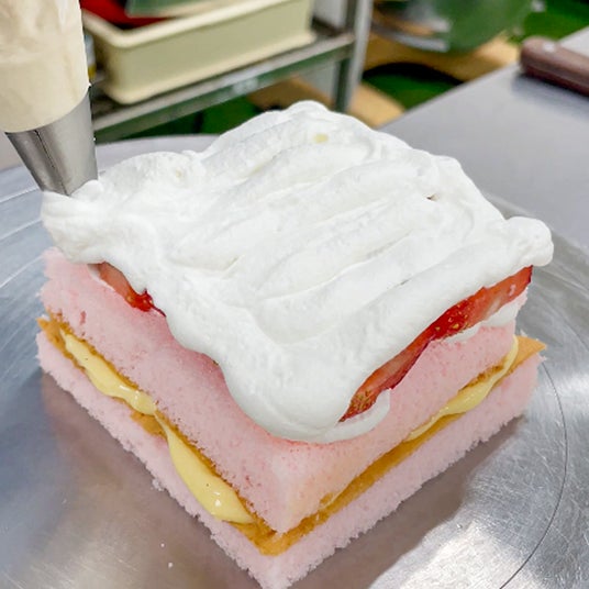 ピンクのスポンジには、苺の濃縮エキスを加えた特製シロップをたっぷり染み込ませ、しっとりふわふわの食感に仕上げました。ひと口頬張れば、ふわっと広がる苺の香りに、思わずうっとり。生クリームだけに見える表面も――中には自家製カスタードクリームがたっぷり!