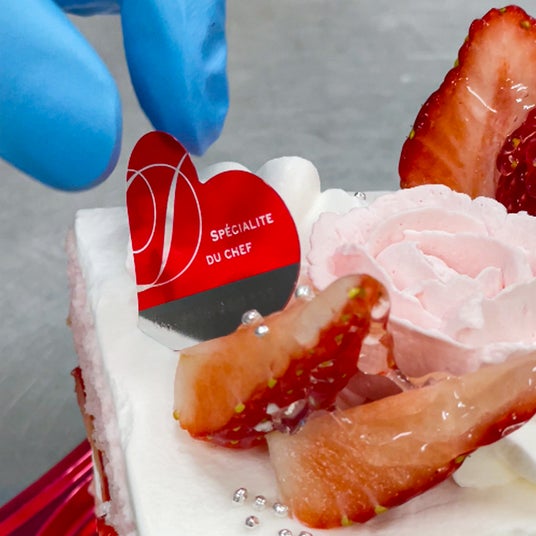 みずみずしさを閉じ込めるナパージュで苺を艶やかに仕上げ、キラリと輝くアラザンで華やかさをプラス。最後に、ハートのケーキピックをそっと添えたら完成です。