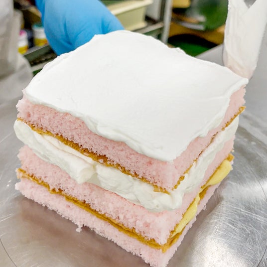 しっとりふわふわ、ベビーピンクのスポンジケーキを重ねて――ついに完成!とびきり可愛い、スペシャル三段ケーキ。