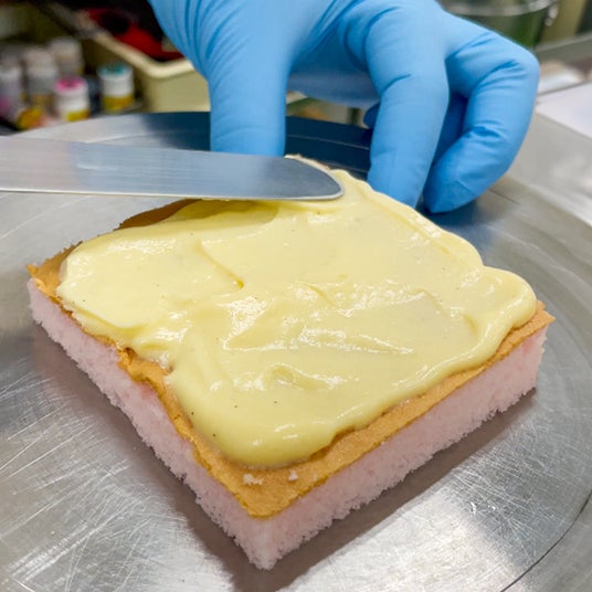 さらに生クリームを重ねて、美しくフォルムを整えます。隅々まで、一つひとつ丁寧に。