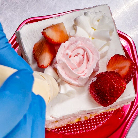 もちろんメインには、ピンクのクリームで丁寧に絞った、愛らしい薔薇の花。まわりには、真っ赤に熟した大粒の苺を、贅沢にトッピング。