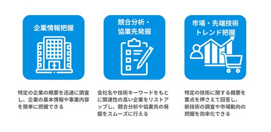 - 企業情報の迅速な取得「ZUVA PRO」に蓄積されたデータを活用し、特定の企業の概要を迅速に調べることができます。これにより、通常のキーワード検索では難しかった、「マイクロ波を活用したスタートアップをリストアップして」などの特殊なテーマ毎の企業の基本情報や事業内容であっても、一度の検索で素早く把握することができます。