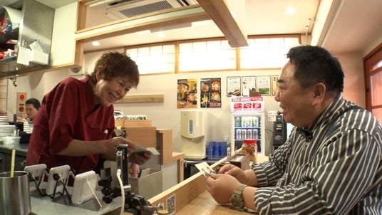 食べ応えがあるモチモチの極太生麺を楽しみつつ、器にたっぷり入ったトッピングを一つずつ堪能し味を伝える塚地の姿に客の親子が「自分が食べているかのように味が伝わって来て、芸能人ってすごい」と感動。