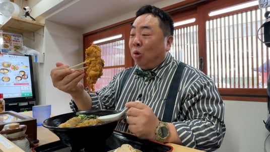 ボリューミーなそばをすするボリューミーな塚っちゃんはナレーションの柳家喬太郎も太鼓判!
