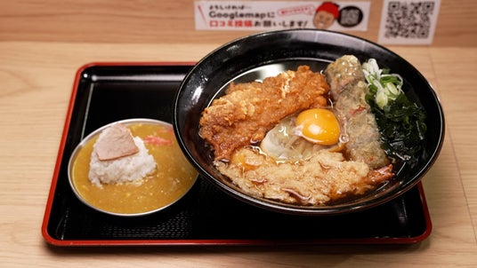 おススメのそばは極太生麺1.5玉、店主自慢のニンニクが効いた特製唐揚げ、山口県の老舗蒲鉾店仕入れているちくわを1本まるまる使ったちくわ天、えび天、玉子が入ったボリューミーなその名も「そばっちゃん」。