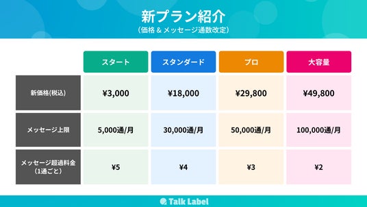 LINE自動化ツール 「TalkLabel(トークラベル)」 を運営する 株式会社SPIRITS(本社:東京都新宿区、代表取締役:山田 光崇)は、2025年5月1日(木)より料金プランと月間メッセージ上限を見直し、より柔軟な価格体系へと改定いたします。