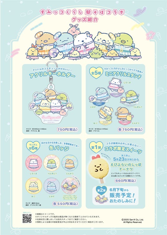 サンエックス株式会社(本社:東京都千代田区)は、阪急電鉄沿線と南海電鉄沿線に「若菜そば」「蕎麦屋のサンジ」等を展開する飲食チェーン、株式会社平野屋(本社:大阪府泉大津市)にて、2025年5月23日(金)から8月17日(日)まで、駅そば全14店舗にて、「すみっコぐらし」とのコラボフェアが開催されることをお知らせします。