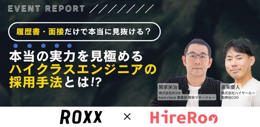 エンジニア組織向けプラットフォームを提供する株式会社ハイヤールー(本社:東京都渋谷区、代表取締役:葛岡宏祐)が提供するAI時代のスキル面接サービス『HireRoo(ハイヤールー)』( https://hireroo.io )は、株式会社ROXX back check 事業部 開発マネージャー の関家 栄治様をお招きし、「履歴書・面接だけで本当に見抜ける? 本当の実力を見極める、ハイクラスエンジニア採用手法とは」をテーマにイベントを共同開催しました。