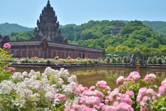 アンコール王朝最盛期の栄華を物語る本格的な寺院を忠実に再現した「プラサット・ヒン・アルン」の「大バラ庭園」では、建物の周囲と池の周りを囲むように咲き誇る色とりどりのバラをお楽しみいただけます。