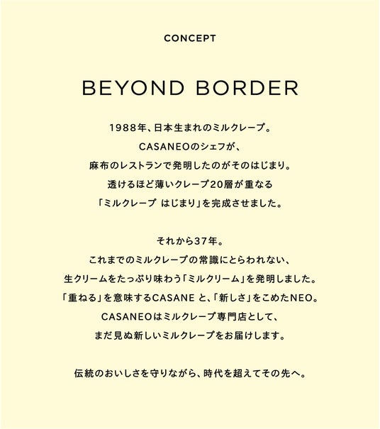 それから37年。これまでのミルクレープの常識にとらわれない、生クリームをたっぷり味わう“ミルクリーム”を発明しました。CASANEOはミルクレープ専門店として、伝統のおいしさを守りながら、まだ見ぬミルクレープをお届けします。