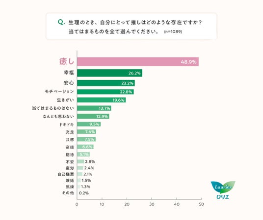 全体の約半数にあたる48.9%が生理のとき、自分にとって推しは「癒し」と回答。このほか、「幸福」や「安心」、「モチベーション」、「生きがい」といったポジティブな言葉を選ぶ人が多く、本来推し活は生理中もポジティブなマインドを後押しする活動であることがわかります。