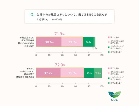 お風呂上がりのシーンについて聞いてみると、72.9%が「お風呂上がりに経血を見て現実に引き戻される」と回答。また、「お風呂上がりに何で下半身を拭くべきかわからない」と感じている女性が71.3%という結果になりました。