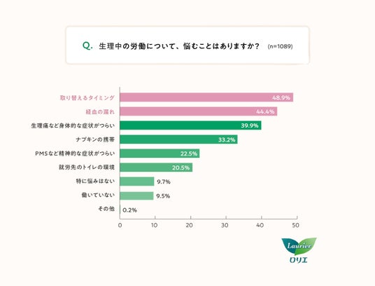 その中でもナプキン取り替えのタイミングや経血の漏れに悩む人が全体の約半数という結果になりました。心身の不調と同じように、働く環境においても負担があると言えます。