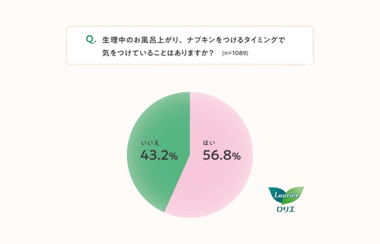 さらに、お風呂上がりにナプキンをつけるタイミングで気をつけていることの有無を問う設問では、56.8%が「ある」と回答。どのようなことに気をつけているかを尋ねると、「身体の水分を拭く前にナプキンをつける」「とにかくすぐにナプキンをつける」「ティッシュで拭く」といった答えが多く寄せられました。入浴後の経血ケアが手探りの状況にあるという戸惑いや不便さから、お風呂上がりも “リターンタイム”のひとつとなり、推し活にも影響をあたえていると考えられます。