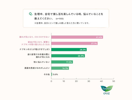 また、生理中の推し活頻度に変化がある人のうち約2人に1人が、「経血漏れ」が生理中の推し活の頻度へ影響を与えると回答。生理中の自宅での推し活で悩んでいることとして「経血の漏れが気になり、ゴロゴロできない」や「経血が気になり、頻繁にナプキンの取り替えをしたくなる」という回答が挙げられており、生理の経血が推し活に夢中な状態から意識が引き戻されるタイミング=“リターンタイム”の一因となっている状況があります。