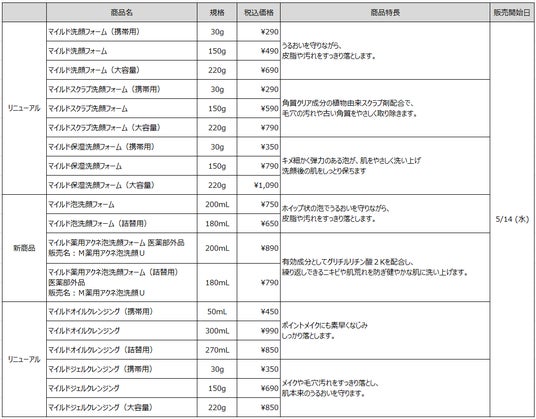 - ホイップ状の泡で手軽に洗顔できる「マイルド泡洗顔フォーム」と、繰り返しできるニキビを防ぐ「マイルド薬用アクネ泡洗顔フォーム」を新たに品揃えしました。泡洗顔フォーム2種には、詰替用もご用意し、容器を捨てずに繰り返し使用することができます。