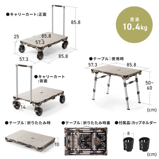 掲載ページキャリーカート & アウトドア テーブル 耐荷重100kg 折りたたみ 2WAY 多機能 高さ調整 4輪 ハンドル付き ベージュ