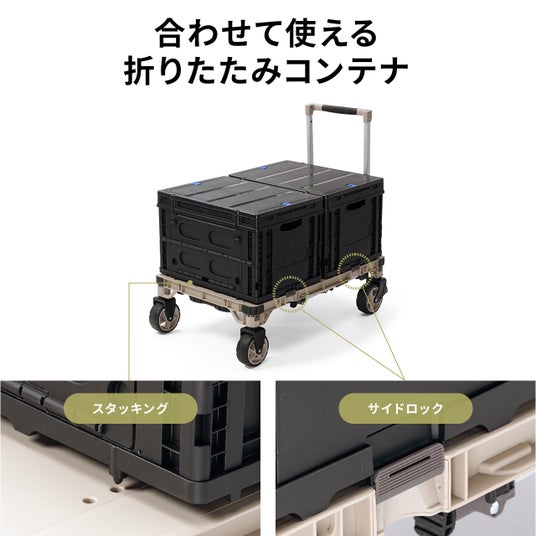 ●折りたたみコンテナ(100-CNV001CV)が2つ載せられるサイズで、本製品にピッタリはまる溝があり、動かしてもズレなくなっています。