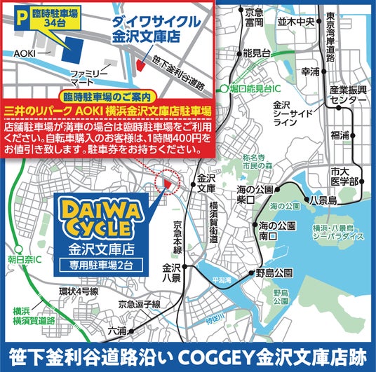 ダイワサイクルSTYLE金沢文庫店は、笹下釜利谷道路沿い、COGGEY金沢文庫店後に開店いたします。店舗裏に専用駐車場2台のご用意もございますので、お車でもお越しいただけます。また、京急本線 金沢文庫駅西口から徒歩約6分と近く、小学校と中学校の間に位置しており、通勤通学や、お子様の送迎などの際にお立ち寄りいただきやすい立地となっております。空気入れ・お困りごとなどありましたらお気軽にお立ち寄りください。