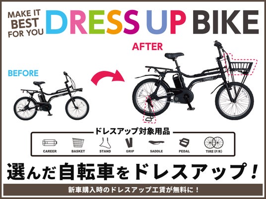 また、ダイワサイクルSTYLE金沢文庫店では「着替えたくなる自転車を」をコンセプトに、お客様の自転車をドレスアップして自分だけの自転車に着替えさせることができる新業態店舗です。お客様の好みに合わせてカゴやグリップ、タイヤなどをカスタムすることができます。タイヤの色を黒からベージュにカスタムして明るい印象にしたり、カゴをアルミ素材にカスタムして軽やかに使用することも可能です。ぜひ、ダイワサイクルSTYLE金沢文庫店にて、お客様のお気に入りの一台をドレスアップしてみてはいかがでしょうか。