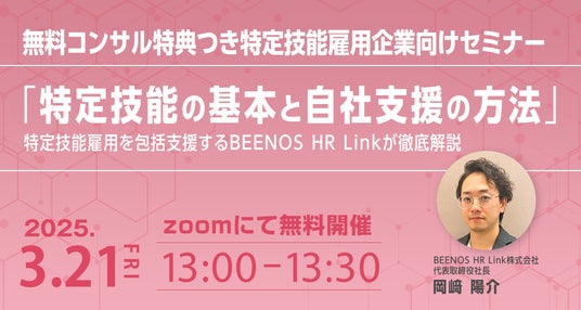 BEENOS株式会社(東証プライム:3328)の連結子会社で、特定技能雇用を包括支援するBEENOS HR Link株式会社(以下「BEENOS HR Link」)は特定技能の受け入れ企業に向けて特定技能の基本と自社支援の方法についてご紹介する定期セミナーの初回を3月21日(金)に開催いたします。