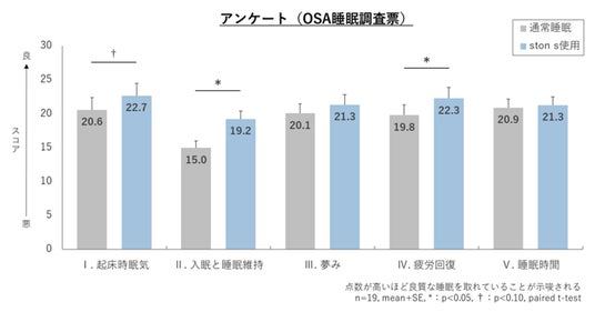 起床時の自身の睡眠を評価する心理尺度であるOSA睡眠調査票を用いたアンケート評価で、睡眠に関する主観的評価を比較しました。5つの睡眠因子のうち、以下の3つの睡眠因子において、通常睡眠と比較して深呼吸サポートデバイス「ston s(ストンエス)」を睡眠前に使用した方が、有意に点数が高いことが確認されました。