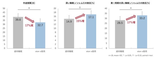 脳波計を用いて睡眠中の睡眠ステージの判定を行いました。その結果、通常睡眠と比較して深呼吸サポートデバイス「ston s(ストンエス)」を睡眠前に使用した方が有意に中途覚醒時間の減少、最も深い睡眠(ノンレム睡眠のステージ3(以下、S3))の割合の増加がみられました。さらに睡眠の質を左右する第1周期(黄金の90分)における最も深い睡眠(S3)の割合の増加も見られました。