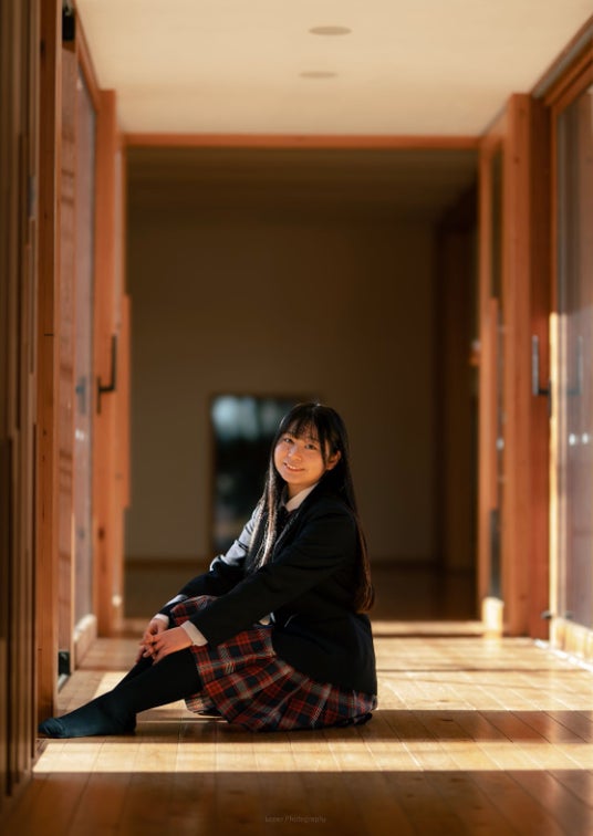 自由学園みらいかん(高2 Kさん)2017年度に完成した自由学園みらいかんは、70年間生徒が育ててきた木が建材や家具に用いられています。初等部の時からお世話になったこの場所で、私たちが次世代や環境問題に対しての希望を抱き作り上げてきた制服を撮影したいと考えました。