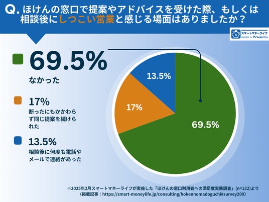 一方で、17%の人は『断ったにもかかわらず、同じ提案を続けられた』と回答しており、多少の押し売りを感じた人もいるようです。また、13.5%の人は『相談後に何度も電話やメールで連絡があった』と回答しており、フォローアップが過剰と感じたケースも一定数見受けられます。