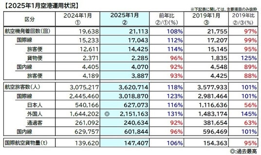 2025年1月 空港運用状況 航空旅客数が2019年同月を上回る362万人へ回復国際線外国人旅客数は2カ月連続で開港以来の最高値を更新