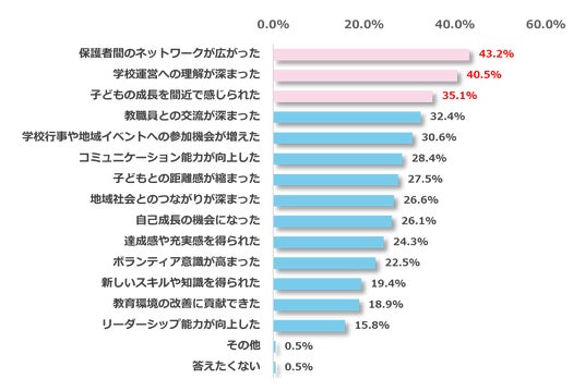 PTA役員を経験して良かったと回答した保護者222名を対象に、その理由を調査しました。その結果、最多回答は「保護者間のネットワークが広がった(43.2%)」、次に「学校運営への理解が深まった(40.5%)」、「子どもの成長を間近で感じられた(35.1%)」となりました。