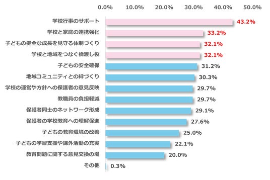 PTAが必要だと回答した保護者340名を対象に、その理由を調査しました。その結果、最多回答は「学校行事のサポート(43.2%)」、次に「学校と家庭の連携強化(33.2%)」、「子どもの健全な成長を見守る体制づくり(32.1%)」、「学校と地域をつなぐ橋渡し役(32.1%)」となりました。