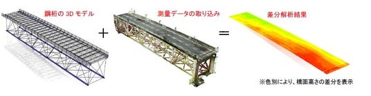 本システムは、床版の3Dモデル生成だけでなく、鋼桁の3Dモデルの生成および測量データの取り込みによる現況と設計の差分解析・修正も可能です。