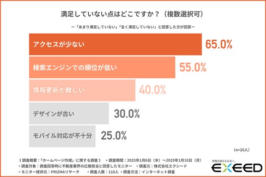 前の質問で『あまり満足していない』『全く満足していない』と回答した方に、「満足していない点はどこですか?(複数選択可)」と質問したところ、『アクセスが少ない(65.0%)』と回答した方が最も多く、『検索エンジンでの順位が低い(55.0%)』『情報更新が難しい(40.0%)』となりました。
