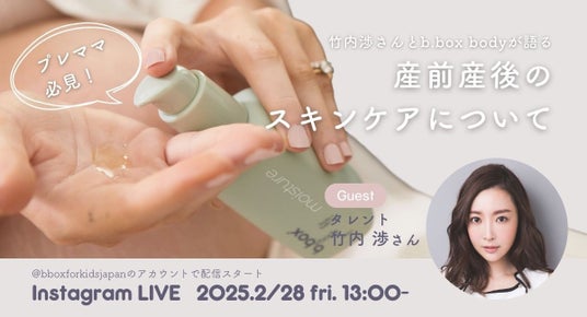 このLIVEでは、竹内渉さんが「妊娠中・産後のスキンケアやライフスタイルの変化」について語ります。実際に感じた肌の悩みやメンタルの変化など、リアルな体験談を交えながらスキンケアの大切さをお話しします。また、竹内さんが愛用するb.box bodyのスキンケアアイテムの中から、お気に入りポイントを大公開!実際にどのアイテムをどんな風に使っているのか、使い心地や選んだ理由を詳しくご紹介します。現在妊娠中の方や産後間もない方必見の内容となっています。心地よいスキンケアタイムのヒントを、一緒に見つけませんか?
