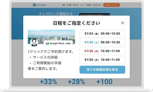 株式会社immedioimmedioは、ウェブサイト上で見込み顧客との商談調整を完結する、Web接客ツールを提供しています。私たちはテクノロジーの力で、サービスを作る側と探す側双方の体験を改善していきます。ビジネスの出会いから不効率を排除し、サービスを探す体験がもっと楽しくなる、サービスを作る側は価値の創出とデリバリーに専念できる、そんな社会を作っていくのが私達のミッションです。