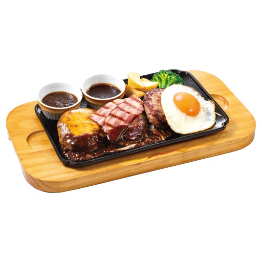 ベーコン、目玉焼きをトッピングした3種類の手ごねハンバーグをご堪能頂ける商品です。ソースを2種類からお選びいただけるため、お好みに合わせてお楽しみいただけます。