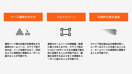 スワイプ型ホームページには、従来型のホームページにはない3つの特徴があります。