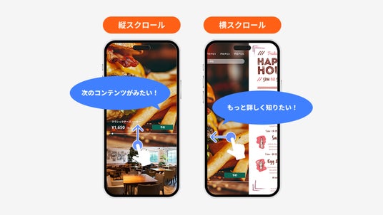 従来の下方向へのみスクロールするホームページ/Webサイトとは異なり、SNSで慣れ親しんだスワイプ操作でコンテンツを表示することが可能です。ユーザーの興味関心に応じて、例えば縦スクロールで様々な情報を閲覧し、横スクロールで気になった情報をより詳しく知ることができます。