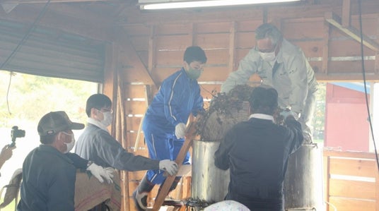 精油の採取量を増やすため、熱い蒸気の中、上から押し込む体力作業