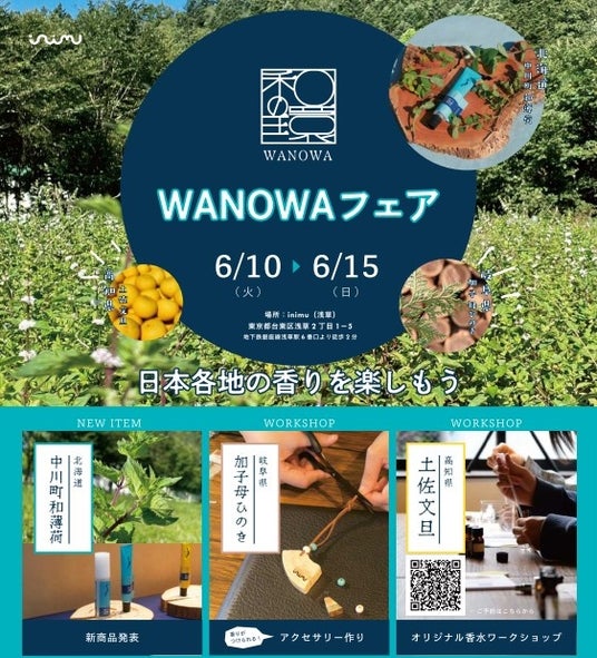 北海道中川町・和薄荷商品の発売を記念して、2025年6月10日(火)~15日(日)キャライノベイトの直営店であるinimu(イニム)浅草店にて、WANOWAフェアの開催が決定。新商品に加え、定番人気の商品すべてをお試しいただけ、フェア期間限定のワークショップやWANOWA関連の各地域で作られている特産品の販売なども予定しています。初夏のお出かけにぜひお越しください。